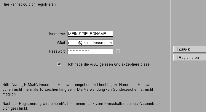 Danach wird dir eine eMail mit einem Link zum Freischalten deines Spieleraccounts zugesendet. Diesen Link musst du anklicken (oder kopieren und in die Adressleiste deines Browsers einfügen), dann wird dein Account freigeschaltet und du kannst dich einloggen.
