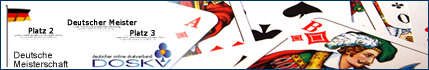 | Die DM 2010 ist beendet und wir können ein positives Fazit ziehen. 388 Teilnehmer maßen sich in diesem Jahr um den besten online Skatspieler Deutschlands zu ermitteln. Um den Meister küren zu können wurden insgesamt 2003 Serien mit 72.108 Spielen absolviert. Nach Vorrunde und Play Off erreichten 54 Spieler das Halbfinale in welchem hart um die neun Finalplätze gekämpft wurde. Knapp ging es zu. So trennten Platz 9 und 10 lediglich 0,6 Punkte. Im Finale setzte sich schließlich unser |